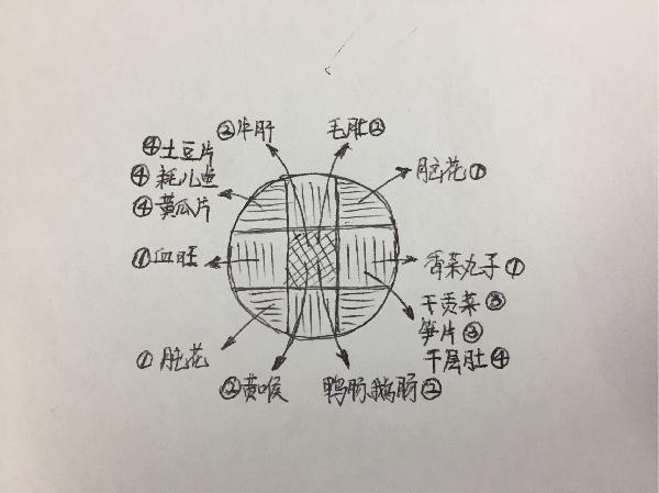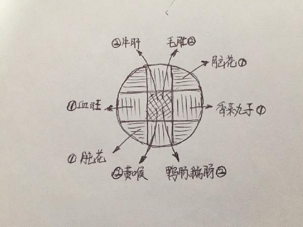 毛肚、鴨腸、鵝腸、牛肝、腰片、香菜丸子、土豆、黃瓜片、腦花、千層肚、肫(jun)花、血旺、黃喉、貢菜、筍片、老肉片、耗兒魚……